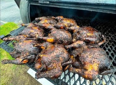 ROTISSERIE SIZE BIRDS THAT ARE SMOKED WHOLE THEN SPLIT OR PULLED TO ORDER